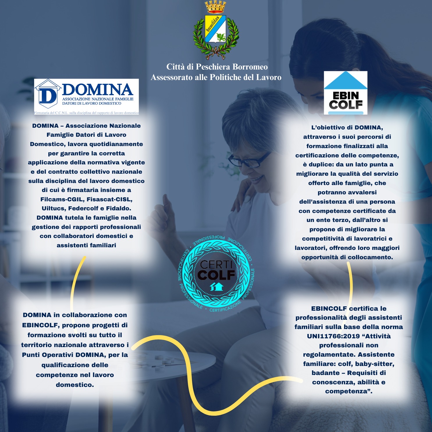 Il percorso formativo verrà gestito da Domina (Associazione Nazionale Famiglie Datori di Lavoro Domestico), che in collaborazione con EBINCOLF, Ente bilaterale del settore del lavoro domestico, opera con il marchio “CERTICOLF” in qualità di Organismo di Certificazione delle Competenze Accreditate. Domina tutela le famiglie nella gestione dei rapporti professionali con collaboratori domestici e assistenti familiari, offrendo consulenza specializzata attraverso numerosi punti presenti su tutto il territorio nazionale; lavora quotidianamente per garantire la corretta applicazione della normativa vigente e del contratto collettivo nazionale sulla disciplina del lavoro domestico di cui è firmataria.
