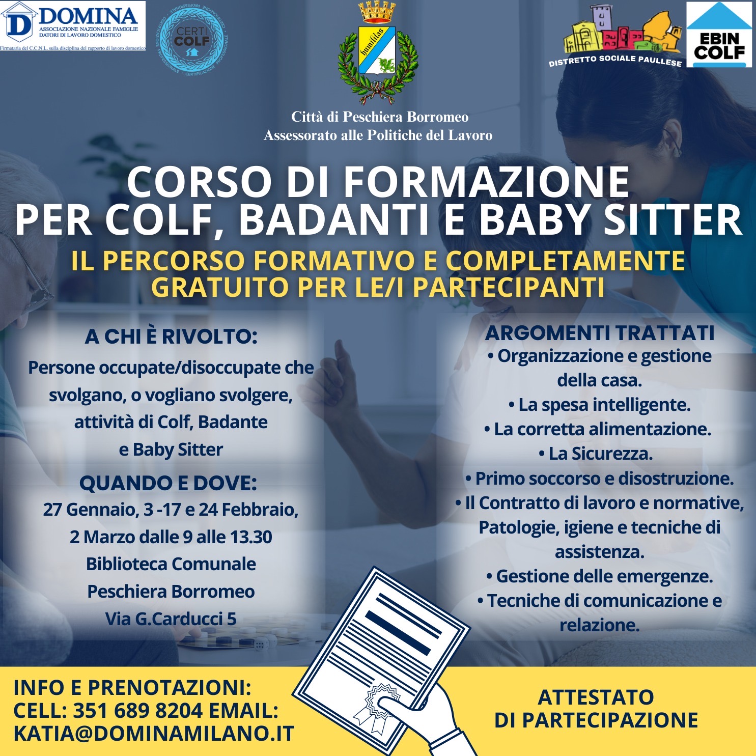 Certificare e formare gratuitamente le figure degli assistenti familiari, comunemente chiamati colf, badanti, baby-sitter.